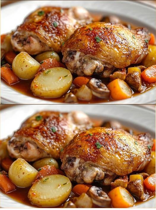 - Place the marinated chicken thighs on top of the vegetables. Add small pieces of butter over the chicken and vegetables. Pour the chicken broth around (but not over) the chicken skin. Bake uncovered for 35–40 minutes until the chicken reaches an internal temperature of 75°C (165°F) and the skin is golden.