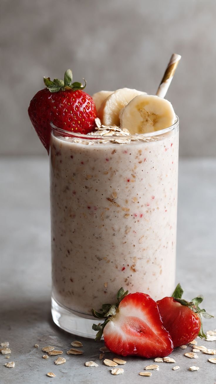 Serve: Pour into a tall glass. Top with a few fresh strawberry halves, banana slices, and a pinch of oats for that “café-style” presentation. Add a straw and enjoy immediately!