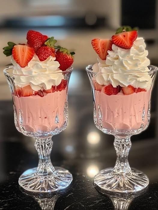 Garnish and Serve: Just before serving, top with a layer of sliced strawberries, a large swirl of whipped cream, and fresh strawberry halves for garnish.
