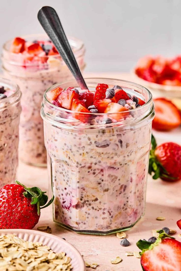 In the morning, give the oats a quick stir. If the mixture is too thick, splash in a little extra milk. Top with the remaining fresh strawberries and a few extra chocolate chips for a bit of crunch.