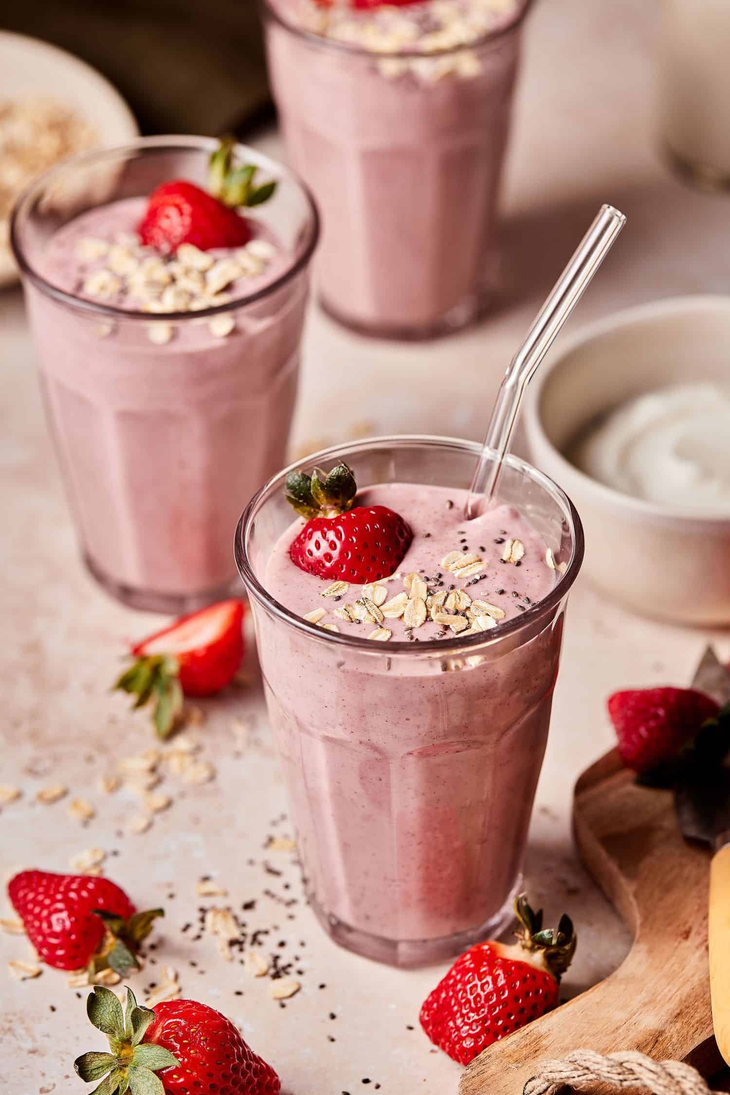 Serve: Pour into glasses and garnish with a fresh strawberry and a sprinkle of raw oats on top, just like the picture.