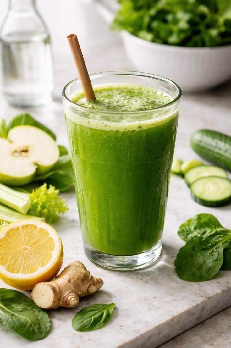 If using a juicer, feed the ingredients through in this order: spinach, ginger, lemon, apple, and finally the cucumber and celery. The high water content in the cucumber and celery helps flush the smaller leafy bits through the machine to ensure you get every drop of nutrients.