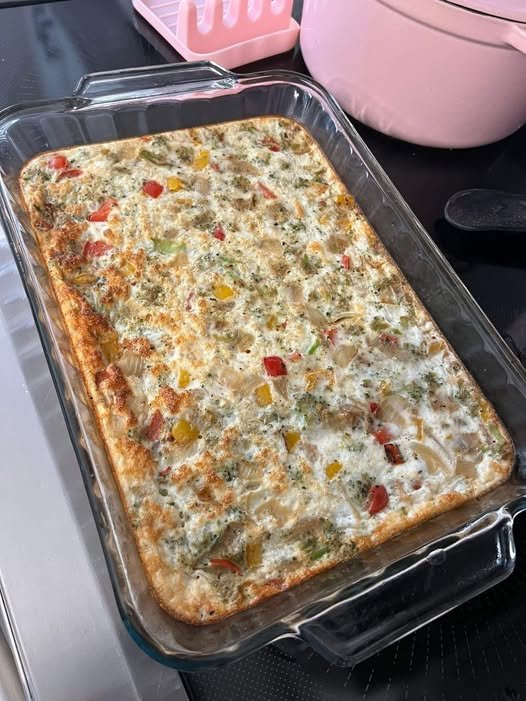 Assemble: Spread the sautéed vegetables evenly across the bottom of the prepared 13×9 pan. Pour the egg white and yogurt mixture over the top.