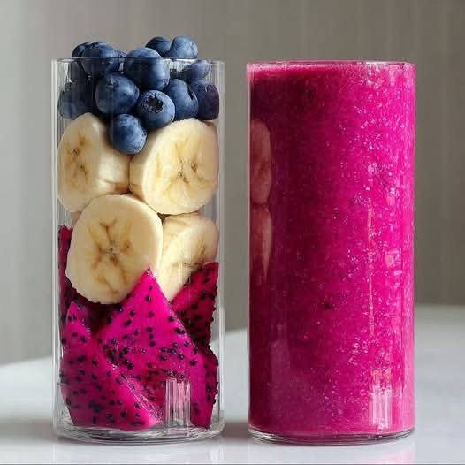 Assemble: To mimic the photo’s “deconstructed” look for a guest or a photo, you can layer fresh slices of banana and dragon fruit against the inside of a glass before pouring the smoothie in, or simply top the finished drink with the extra blueberries.
